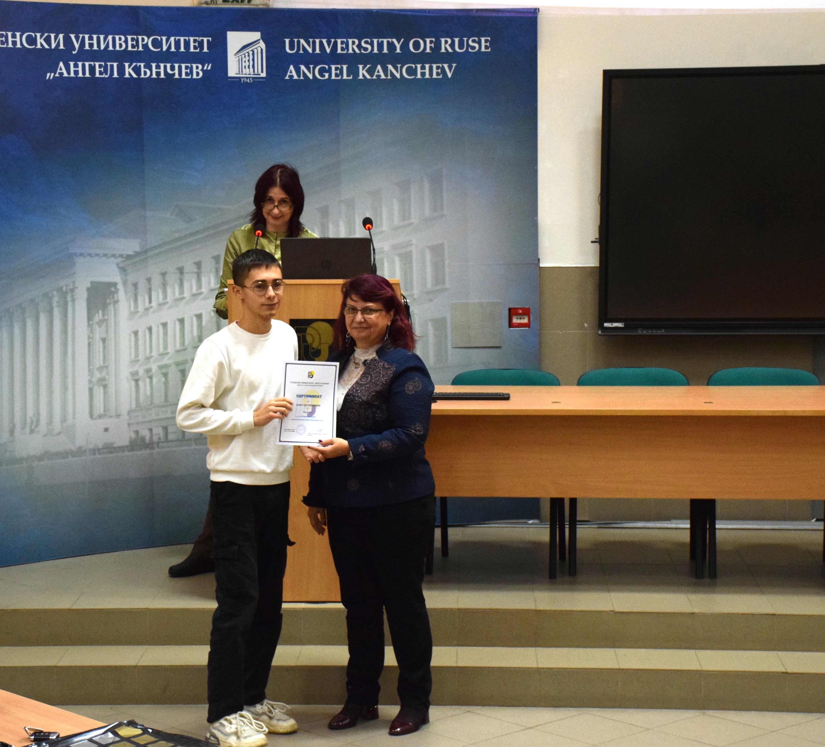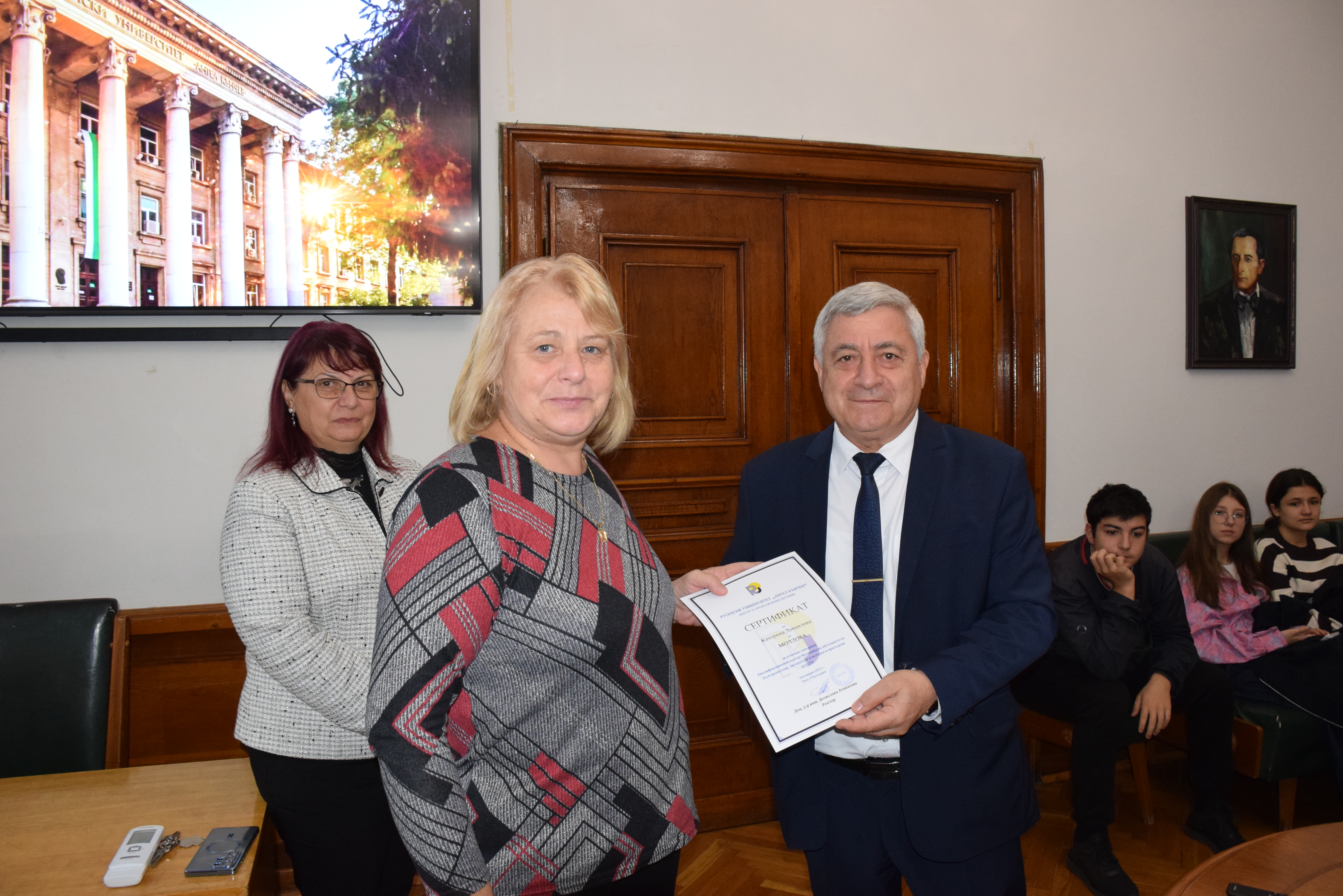The certificates were presented to the teachers by Academician Hristo Beloe, DscEng - Honourary Rector and Chairman of the General Assembly of the University of Ruse, and the Rector of the University of Ruse, Associate Professor Desislava Atanasova, PhD handed out the certificates to the students. The event was attended by lecturers from the departments of "Bulgarian Language, Literature, History and Arts" and "Foreign Languages".