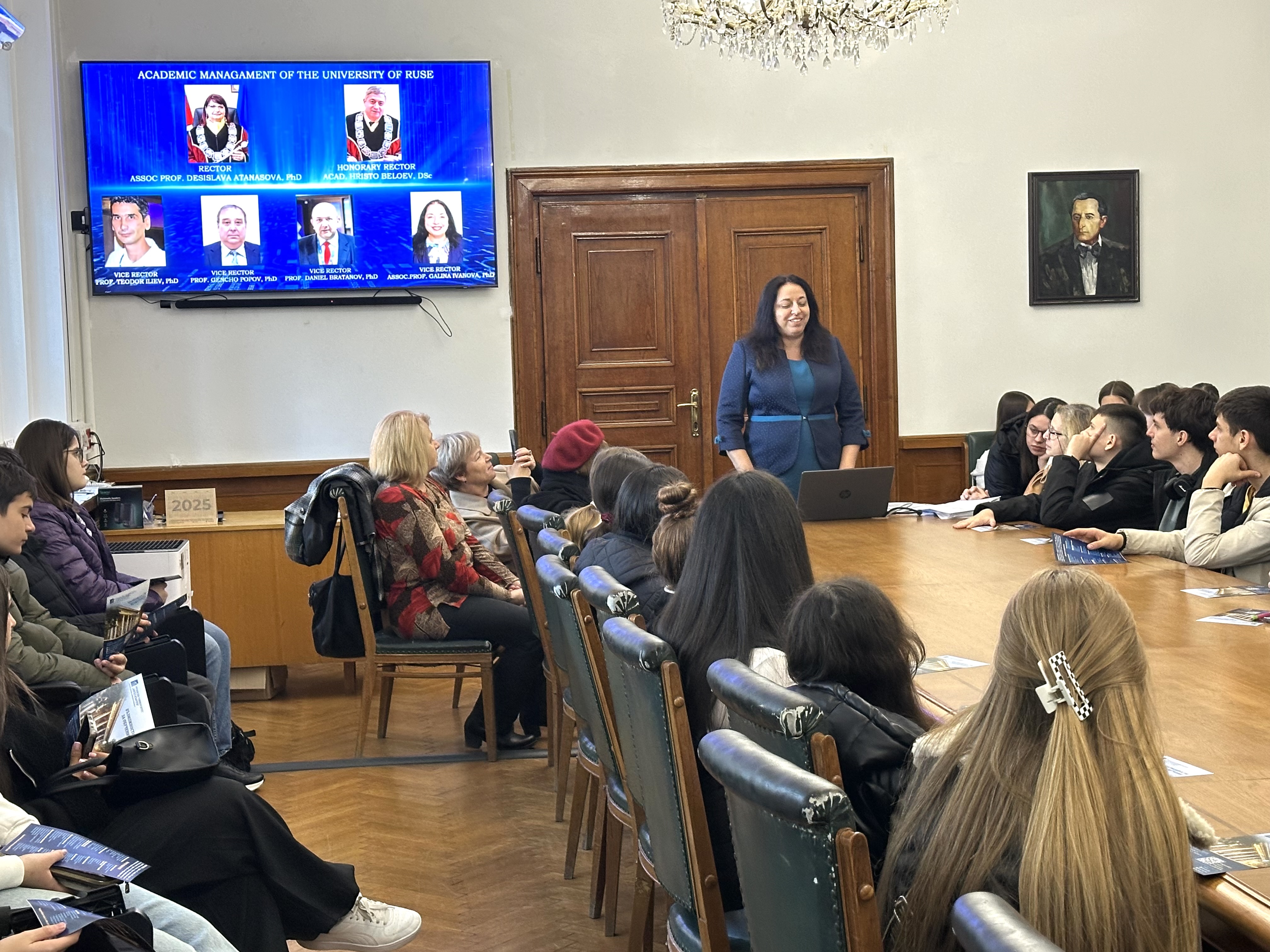 The group was welcomed by the Vice-Rector for International Cooperation, Associate Professor Galina Ivanova, PhD. She introduced them to the modern educational facilities, the structure of the university, and the opportunities that the University of Ruse offers to its students.